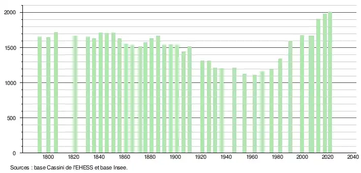 L'évolution du nombre d'habitants est connue à travers les recensements de la population effectués dans la commune depuis 1793. Pour les communes de moins de 10 000 habitants, une enquête de recensement portant sur toute la population est réalisée tous les cinq ans, les populations légales des années intermédiaires étant quant à elles estimées par interpolation ou extrapolation[33]. Pour la commune, le premier recensement exhaustif entrant dans le cadre du nouveau dispositif a été réalisé en 2007[34].