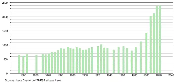 | L'évolution du nombre d'habitants est connue à travers les recensements de la population effectués dans la commune depuis 1793. Pour les communes de moins de 10 000 habitants, une enquête de recensement portant sur toute la population est réalisée tous les cinq ans, les populations légales des années intermédiaires étant quant à elles estimées par interpolation ou extrapolation[34]. Pour la commune, le premier recensement exhaustif entrant dans le cadre du nouveau dispositif a été réalisé en 2006[35]. En 2021, la commune comptait 2 404 habitants[Note 8], en augmentation de 3,31 % par rapport à 2015 (Gironde : +6,88 %, France hors Mayotte : +1,84 %). |