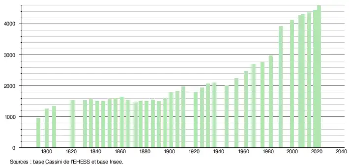 L'évolution du nombre d'habitants est connue à travers les recensements de la population effectués dans la commune depuis 1793. Pour les communes de moins de 10 000 habitants, une enquête de recensement portant sur toute la population est réalisée tous les cinq ans, les populations légales des années intermédiaires étant quant à elles estimées par interpolation ou extrapolation[23]. Pour la commune, le premier recensement exhaustif entrant dans le cadre du nouveau dispositif a été réalisé en 2008[24].
