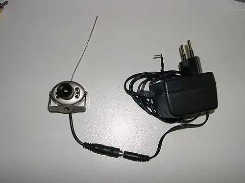Certains modèles de caméra sans-fil incluant un faisceau vision nocturne (diodes IR) ; on trouve assez souvent un micro en plus du dispositif vidéo.