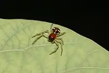 Le céphalothorax de forme quadrangulaire est modérément haut et plus large vers l'avant. Il est de couleur orange à rouge[8] à l'exception de zones noires autour des yeux, des bords latéraux et de la rainure thoracique[2]. La tache sombre de la rainure thoracique semble absente chez le mâle[8].