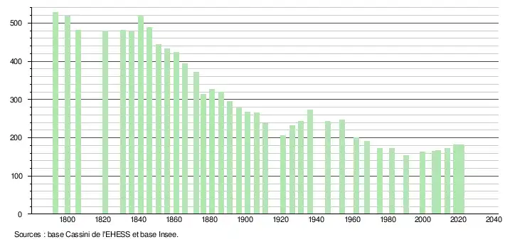 L'évolution du nombre d'habitants est connue à travers les recensements de la population effectués dans la commune depuis 1793. Pour les communes de moins de 10 000 habitants, une enquête de recensement portant sur toute la population est réalisée tous les cinq ans, les populations légales des années intermédiaires étant quant à elles estimées par interpolation ou extrapolation[24]. Pour la commune, le premier recensement exhaustif entrant dans le cadre du nouveau dispositif a été réalisé en 2008[25].