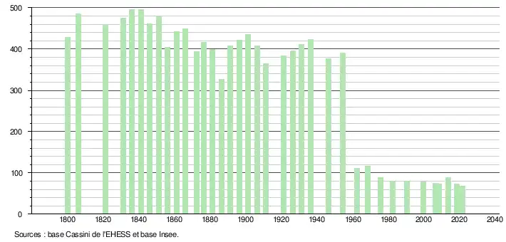 L'évolution du nombre d'habitants est connue à travers les recensements de la population effectués dans la commune depuis 1800. Pour les communes de moins de 10 000 habitants, une enquête de recensement portant sur toute la population est réalisée tous les cinq ans, les populations légales des années intermédiaires étant quant à elles estimées par interpolation ou extrapolation[13]. Pour la commune, le premier recensement exhaustif entrant dans le cadre du nouveau dispositif a été réalisé en 2008[14].