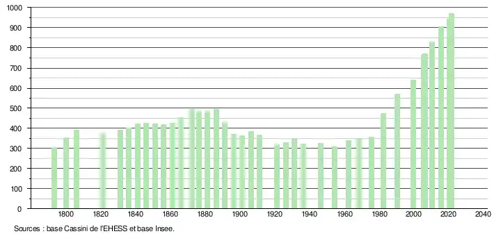 | L'évolution du nombre d'habitants est connue à travers les recensements de la population effectués dans la commune depuis 1793. Pour les communes de moins de 10 000 habitants, une enquête de recensement portant sur toute la population est réalisée tous les cinq ans, les populations légales des années intermédiaires étant quant à elles estimées par interpolation ou extrapolation[33]. Pour la commune, le premier recensement exhaustif entrant dans le cadre du nouveau dispositif a été réalisé en 2005[34]. En 2021, la commune comptait 971 habitants[Note 7], en augmentation de 7,17 % par rapport à 2015 (Tarn : +1,82 %, France hors Mayotte : +1,84 %). |