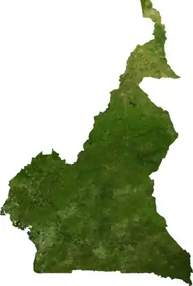Le pays se situe entre la bordure méridionale du Sahara et la limite septentrionale de la forêt équatoriale du bassin du Congo au sud. L'ouest du pays est dominé par les Hauts-Plateaux, et comprend le massif le plus haut de toute l'Afrique de l'Ouest : le mont Cameroun, qui culmine à 4 070[36] mètres ; c'est le neuvième sommet du continent africain. L'est du pays est recouvert dans sa très grande majorité d'une forêt équatoriale encore bien conservée. Le long de ses 590 km de côtes, on compte quelques cités balnéaires : Kribi, et Limbé près du mont Cameroun.