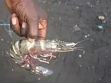 Une gambas pêchée à Limbé, non loin de l'embouchure du Wouri, dont le nom en portugais, camarão, donne le nom : Cameroun.