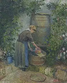 Outre les scènes rustiques et quotidiennes du paysage rural français, il peint fréquemment des femmes absorbées par les activités quotidiennes. En effet, à partir de 1879, il commence à créer un certain nombre d'études de figures monumentales qui reflètent son intérêt croissant pour la primauté de la forme humaine dans le paysage, un thème qui se poursuivra tout au long de sa carrière. C'est ainsi que Femme lavant une casserole, ainsi que La Cardeuse de laine (National Gallery)[52] sont présentées à la cinquième Exposition Impressionniste en 1880[53].