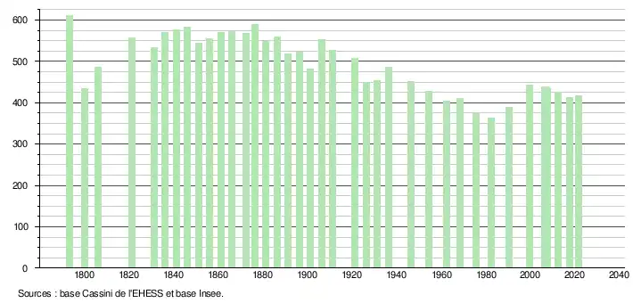 L'évolution du nombre d'habitants est connue à travers les recensements de la population effectués dans la commune depuis 1793. Pour les communes de moins de 10 000 habitants, une enquête de recensement portant sur toute la population est réalisée tous les cinq ans, les populations légales des années intermédiaires étant quant à elles estimées par interpolation ou extrapolation[25]. Pour la commune, le premier recensement exhaustif entrant dans le cadre du nouveau dispositif a été réalisé en 2007[26].