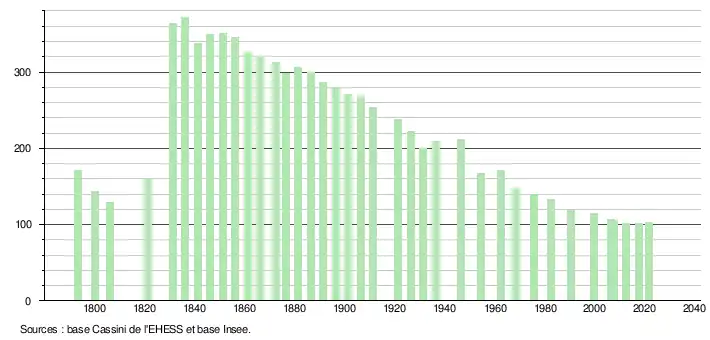 L'évolution du nombre d'habitants est connue à travers les recensements de la population effectués dans la commune depuis 1793. Pour les communes de moins de 10 000 habitants, une enquête de recensement portant sur toute la population est réalisée tous les cinq ans, les populations légales des années intermédiaires étant quant à elles estimées par interpolation ou extrapolation[50]. Pour la commune, le premier recensement exhaustif entrant dans le cadre du nouveau dispositif a été réalisé en 2007[51].