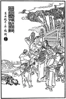 C'est alors que Lü Bu sort à nouveau de son camp pour narguer la coalition. Cette fois-ci, Gongsun Zan part défier Lü Bu, mais doit se retirer après quelques rounds. Lü Bu le pourchasse, mais il est distrait par Zhang Fei qui l’appelle "un esclave avec trois surnoms" (三姓家奴)[lower-alpha 3]. Furieux, Lü Bu cesse sa poursuite et engage un duel contre Zhang Fei. Le duel dure cinquante rounds, sans que l'un des deux ne prenne l'avantage sur l'autre. Voyant cela, Guan Yu se précipite dans la mêlée pour aider Zhang Fei. Le duel entre les trois combattants dure trente rounds de plus, avant que Liu Bei, brandissant une paire de sabres, ne rejoigne le combat.