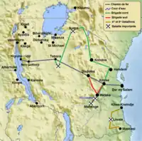 Le , elle occupe ses quartiers à Dodoma et à Kilosa. Le , après avoir été rejointe par la « brigade nord »[20], la Force publique se met en route avec Mahenge, le quartier général de von Lettow-Voorbeck, comme objectif.