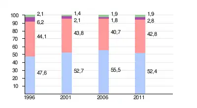 Les autochtones représentent 1,9 % de la population[30] et 1,2 % des habitants font partie d'une minorité visible[31]. Les immigrants représentent 2,0 % de la population et 0,2 % des habitants sont des résidents permanents[32]. 0,9 % des habitants ne sont pas citoyens canadiens et 94,8 % des habitants âgés de plus de 15 ans sont issus de familles établies au Canada depuis trois générations ou plus[32]. En date du , 84,1 % des gens avaient la même adresse depuis au moins un an alors que 9,8 % habitaient auparavant ailleurs dans la même ville, que 3,3 % habitaient ailleurs dans la province, que 2,4 % habitaient ailleurs au pays et que 0,4 % habitaient ailleurs dans le monde[33]. À la même date, 65,2 % des gens avaient la même adresse depuis au moins cinq ans alors que 20,0 % habitaient auparavant ailleurs dans la même ville, que 8,9 % habitaient ailleurs dans la province, que 5,3 % habitaient ailleurs au pays et que 0,6 % habitaient ailleurs dans le monde[33].