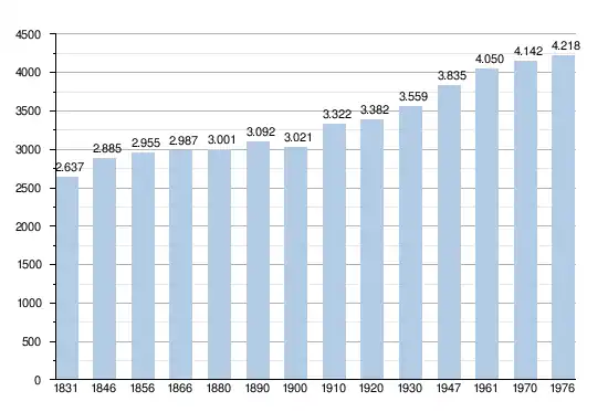 Les chiffres des années 1831 à 1970 tiennent compte des chiffres des anciennes communes fusionnées.