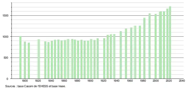 L'évolution du nombre d'habitants est connue à travers les recensements de la population effectués dans la commune depuis 1793. Pour les communes de moins de 10 000 habitants, une enquête de recensement portant sur toute la population est réalisée tous les cinq ans, les populations légales des années intermédiaires étant quant à elles estimées par interpolation ou extrapolation[21]. Pour la commune, le premier recensement exhaustif entrant dans le cadre du nouveau dispositif a été réalisé en 2007[22].