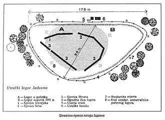 Le camp de Jasenovac est constitué de cinq sites de détention créés entre août 1941 et février 1942 par les autorités de l'État indépendant de Croatie, au confluent des rivières Una et Save. Dirigé par le général oustachi Vjekoslav Luburić puis par Dinko Šakić en 1944, il est le plus grand en Croatie (46 kilomètres carrés, six fois plus étendu qu'Auschwitz)[4].