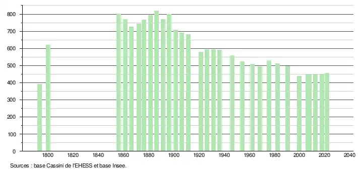 L'évolution du nombre d'habitants est connue à travers les recensements de la population effectués dans la commune depuis 1793. Pour les communes de moins de 10 000 habitants, une enquête de recensement portant sur toute la population est réalisée tous les cinq ans, les populations légales des années intermédiaires étant quant à elles estimées par interpolation ou extrapolation[43]. Pour la commune, le premier recensement exhaustif entrant dans le cadre du nouveau dispositif a été réalisé en 2007[44].