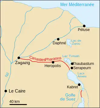 Il est probable que durant la XIIe dynastie, le pharaon Sésostris III (~1850 av. J.-C.) ait fait creuser un canal orienté d'ouest en est à travers le Wadi Tumilat, reliant le Nil à la mer Rouge, afin de pouvoir commercer avec le Ta Netjer (le pays de Pount), permettant ainsi directement les échanges entre la mer Rouge et la Méditerranée. Son existence est certaine au XIIIe siècle av. J.-C., pendant le règne de Ramsès II[8], il est ensuite abandonné.