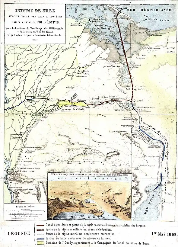 En 1854, le gouverneur d'Égypte Mohamed Saïd Pacha accorde le premier acte de concession du terrain pour la construction du canal à Ferdinand de Lesseps. Mais les Britanniques s'opposent à ce firman qui donnerait une grande influence à la France dans cette région stratégique sur la route des Indes, et demandent à l'autorité supérieure, la Sublime Porte de l'Empire ottoman, de suspendre cette permission[18]. La concurrence pour le contrôle de cette route est en effet forte entre les deux nations occidentales, la Grande-Bretagne soutenant le principe d'une ligne ferroviaire égyptienne, à laquelle le canal ferait concurrence. Lesseps décide de passer outre l'opposition de la Porte en entamant les travaux, au vu et au su de tous, le [19].