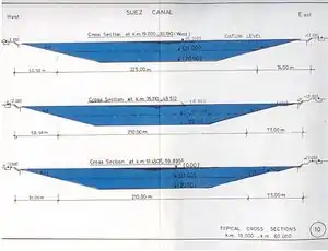 Le canal de Suez (en arabe : قناة السويس, qanāt as-suwēs) est un canal navigable situé en Égypte. Long de 193,3 km, large de 280 à 345 m et profond de 22,5 m, il relie, via trois lacs naturels, la ville portuaire de Port-Saïd en mer Méditerranée à la ville de Suez dans le golfe de Suez (partie septentrionale de la mer Rouge)[2].
