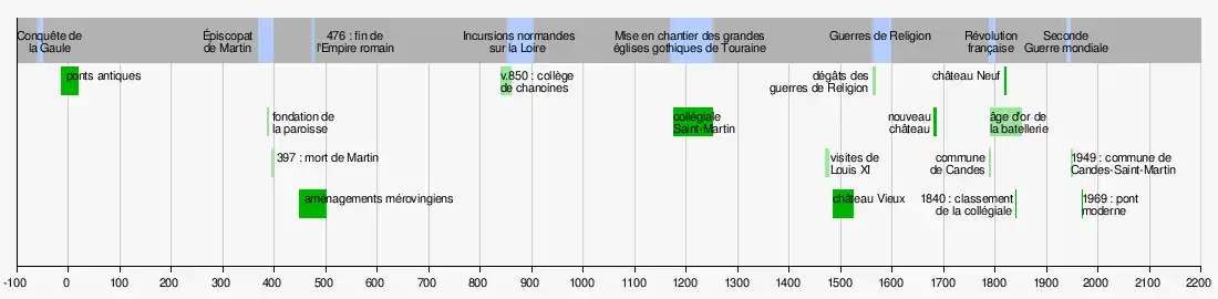 Dès le début de notre ère, une agglomération antique, probablement importante, existe sur ce site stratégique, situé au carrefour des territoires de trois peuples gaulois et contrôlant le confluent Vienne-Loire. Candes profite d'ailleurs de cette situation privilégiée : sa batellerie et les activités qui y sont liées sont longtemps florissantes, mais la disparition du transport fluvial, détrôné par le chemin de fer au milieu du XIXe siècle, marque l'arrêt du développement et la mutation progressive de la commune. À compter de cette date et jusqu'aux années 1930, la population baisse de manière très importante. Elle semble se stabiliser depuis, avec 227 habitants en 2021. C'est également vers le milieu du XIXe siècle, alors que l'économie locale est fragilisée, que des artistes, peintres ou dessinateurs, viennent à Candes pour en reproduire les paysages.