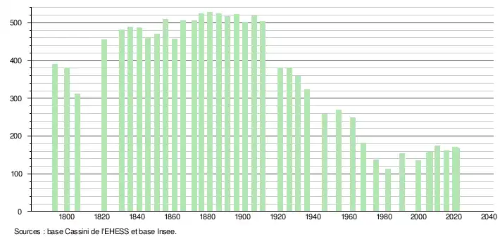 L'évolution du nombre d'habitants est connue à travers les recensements de la population effectués dans la commune depuis 1793. Pour les communes de moins de 10 000 habitants, une enquête de recensement portant sur toute la population est réalisée tous les cinq ans, les populations légales des années intermédiaires étant quant à elles estimées par interpolation ou extrapolation[25]. Pour la commune, le premier recensement exhaustif entrant dans le cadre du nouveau dispositif a été réalisé en 2005[26].