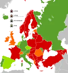 En France, parmi les adultes âgés de 18 à 64 ans, 33 % déclare avoir déjà consommé du cannabis au cours de leur vie, ce qui représente 13,4 millions de personnes[38]. Le nombre de personnes ayant consommé du cannabis dans l’année est de 3,8 millions (8 % de la population), situant la France parmi les pays d’Europe les plus consommateurs, aux côtés de la République tchèque, du Royaume-Uni, de l’Italie et du Danemark[39].