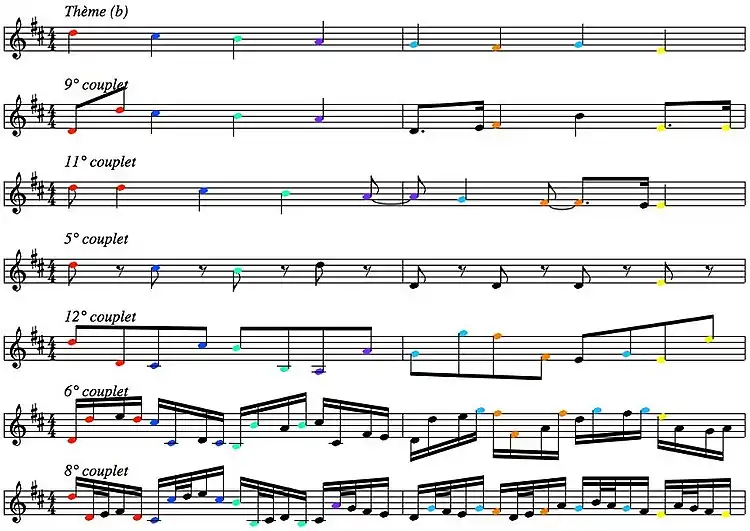 - un thème de quatre mesures, en deux parties [(a) et (b)] superposables, et ses 12 couplets[10], joués successivement par les trois violons en décalage de deux mesures, c'est-à-dire en canon à trois voix[11].