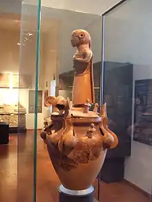 L'ensemble, en impasto (argile peu dégraissée), était placé sur un plus grand vase ou sur un siège, un dossier arrondi de pierre ou de terre-cuite appelé fauteuil de cérémonie (dit « de dignité »)[1]. Tout cet appareillage funéraire était placé dans une grande jarre appelée ziro, recouverte d'une dalle (quelquefois de forme « bouchon de champagne »), et descendu dans un puits (nommé « tombe à ziro »).