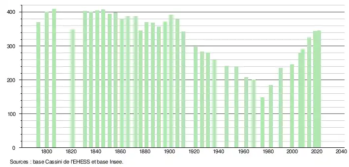 L'évolution du nombre d'habitants est connue à travers les recensements de la population effectués dans la commune depuis 1793. Pour les communes de moins de 10 000 habitants, une enquête de recensement portant sur toute la population est réalisée tous les cinq ans, les populations légales des années intermédiaires étant quant à elles estimées par interpolation ou extrapolation[19]. Pour la commune, le premier recensement exhaustif entrant dans le cadre du nouveau dispositif a été réalisé en 2008[20].