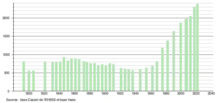 L'évolution du nombre d'habitants est connue à travers les recensements de la population effectués dans la commune depuis 1793. Pour les communes de moins de 10 000 habitants, une enquête de recensement portant sur toute la population est réalisée tous les cinq ans, les populations légales des années intermédiaires étant quant à elles estimées par interpolation ou extrapolation[26]. Pour la commune, le premier recensement exhaustif entrant dans le cadre du nouveau dispositif a été réalisé en 2007[27].