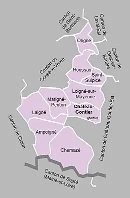 À la suite du redécoupage des cantons pour 2015, les communes de Chemazé, Houssay, Loigné-sur-Mayenne, Origné et Saint-Sulpice sont rattachées au canton d'Azé et les communes d'Ampoigné, Château-Gontier, Laigné et Marigné-Peuton à celui de Château-Gontier.