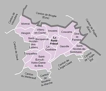 Les anciennes communes suivantes étaient incluses dans le territoire du canton de La Ferté-Frênel[6] :