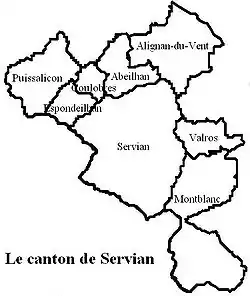 Depuis 2015, les communes de Servian et d'Espondeilhan sont du canton de Béziers-3, les autres sont du canton de Pézenas.