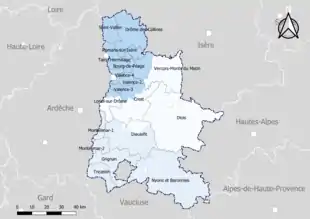 | 2 | Crest | Crest | 26 658 | 1,04 | 28 | Aouste-sur-Sye, Autichamp, Barcelonne, La Baume-Cornillane, Beaufort-sur-Gervanne, Chabrillan, Châteaudouble, Cobonne, Combovin, Crest, Divajeu, Eurre, Gigors-et-Lozeron, Grane, Mirabel-et-Blacons, Montclar-sur-Gervanne, Montmeyran, Montvendre, Omblèze, Ourches, Peyrus, Piégros-la-Clastre, Plan-de-Baix, La Répara-Auriples, La Roche-sur-Grane, Suze, Upie, Vaunaveys-la-Rochette. |