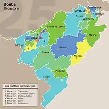 canton d'Amancey - canton d'Audeux - canton de Baume-les-Dames - canton de Besançon-Est - canton de Besançon-Nord-Est - canton de Besançon-Nord-Ouest - canton de Besançon-Ouest - canton de Besançon-Planoise - canton de Besançon-Sud - canton de Boussières - canton de Marchaux - canton d'Ornans - canton de Quingey - canton de Rougemont - canton de Roulans - arrondissement de Montbéliard (12 cantons - sous-préfecture : Montbéliard) :