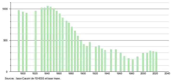 L'évolution du nombre d'habitants est connue à travers les recensements de la population effectués dans la commune depuis 1793. Pour les communes de moins de 10 000 habitants, une enquête de recensement portant sur toute la population est réalisée tous les cinq ans, les populations légales des années intermédiaires étant quant à elles estimées par interpolation ou extrapolation[24]. Pour la commune, le premier recensement exhaustif entrant dans le cadre du nouveau dispositif a été réalisé en 2006[25].