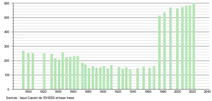 L'évolution du nombre d'habitants est connue à travers les recensements de la population effectués dans la commune depuis 1793. Pour les communes de moins de 10 000 habitants, une enquête de recensement portant sur toute la population est réalisée tous les cinq ans, les populations légales des années intermédiaires étant quant à elles estimées par interpolation ou extrapolation[20]. Pour la commune, le premier recensement exhaustif entrant dans le cadre du nouveau dispositif a été réalisé en 2006[21].