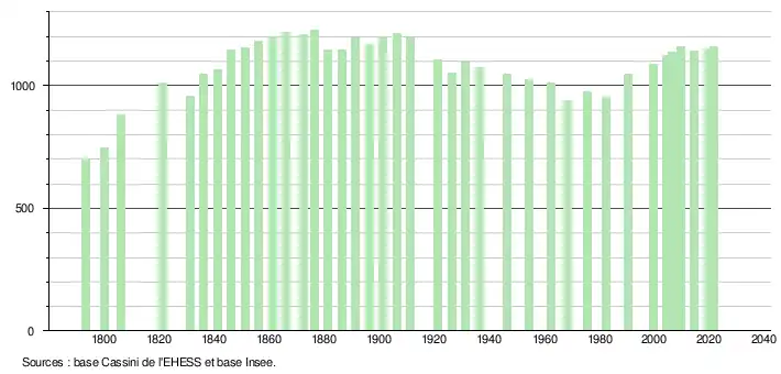 L'évolution du nombre d'habitants est connue à travers les recensements de la population effectués dans la commune depuis 1793. Pour les communes de moins de 10 000 habitants, une enquête de recensement portant sur toute la population est réalisée tous les cinq ans, les populations légales des années intermédiaires étant quant à elles estimées par interpolation ou extrapolation[47]. Pour la commune, le premier recensement exhaustif entrant dans le cadre du nouveau dispositif a été réalisé en 2004[48].