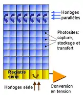 À la fin de l'exposition, les charges sont transférées de photosite en photosite par le jeu de variations de potentiel cycliques appliquées aux grilles (bandes conductrices horizontales, isolées entre elles par une couche de SiO2) jusqu'au registre horizontal (voir animation ci-contre).