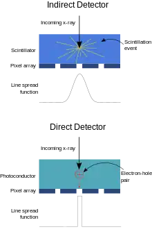 En haut : détecteur indirect, avec matériau scintillateur ; En bas : détecteur direct, avec matériau photoconducteur. La dispersion de la lumière dans le matériau scintillateur conduit à une perte de résolution dans les détecteurs indirects, contrairement aux détecteurs directs.