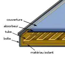 Un capteur plan est un système relativement simple composé d'un absorbeur, une surface « noire » absorbant l'énergie solaire et munie de moyens pour transférer l'énergie absorbée vers le fluide caloporteur, ainsi que d'une couverture protégeant l'absorbeur tout en étant transparente au rayonnement solaire. La face arrière de l'absorbeur ainsi que les côtés de la boîte où le tout est inséré sont isolés pour limiter les pertes thermiques par conduction. Dans les capteurs à circulation de liquide le fluide caloporteur circule dans des tubes, remplacés par des conduits dans les capteurs à air[2],[12].
