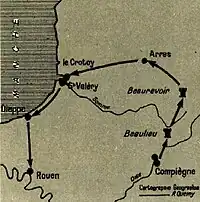 Elle est ensuite conduite à Arras, Drugy-lès-Saint-Riquier, Le Crotoy, Saint-Valery-sur-Somme, Eu, Dieppe et enfin Rouen où elle est étroitement enfermée dans une tour du château construit sur la colline de Bouvreuil.
