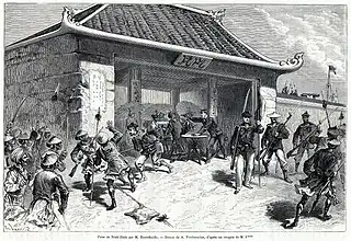 Après avoir ordonné à ses hommes de fixer les baïonnettes et de porter le drapeau, Hautefeuille sauta précipitamment à l'intérieur du petit canot du navire avec six de ses matelots et son interprète, laissant le reste, un matelot et le guide garder la vedette à vapeur et son canon. Hautefeuille et ses sept hommes se dirigèrent alors vers le rivage tandis que les canons de la citadelle leur tiraient quelques coups sans succès, tandis que les soldats vietnamiens sortaient en grand nombre de la forteresse[4]. Lorsque l'escouade débarqua, elle fut immédiatement envahie par des villageois curieux et amicaux, dont certains tentèrent même d'offrir un bœuf au jeune officier[5]. Hautefeuille et ses hommes marchèrent alors d'un pas ferme vers la porte de la citadelle. La petite escouade fut bientôt encerclée par des soldats vietnamiens, qui marchèrent à leurs côtés en pointant leurs lances et leurs fusils, sans oser déclencher les hostilités et espérant probablement les attraper vivants. En arrivant près des douves, Hautefeuille remarqua le gouverneur de la province, Nguyễn Vũ, qu'il reconnut instantanément comme tel grâce aux quatre porteurs de parapluies qui l'entouraient[2].Son pistolet à la main, Hautefeuille s'excuse d'avoir bombardé le fort et précise que c'est en réponse aux cris. Il demande ensuite au gouverneur quelle est sa position sur la proclamation de Garnier concernant l'ouverture du commerce sur la rivière Rouge. Le gouverneur répondit qu'il l'acceptait pleinement et qu'il ne s'opposerait pas aux Français. En guise de réponse, Hautefeuille sort un papier officiel pris sur le mandarin qu'il avait brièvement capturé au barrage, deux jours plus tôt. Le journal était un ordre écrit du gouverneur proclamant la conscription des villageois pour construire des barrages sur la rivière. Le gouverneur Nguyễn Vũ est assez embarrassé et Hautefeuille lui demande une preuve écrite de sa soumission au testament de Garnier. Le gouverneur consentit, mais lorsque Hautefeuille demanda à entrer dans la forteresse à ses côtés pour assister à l'écriture, Nguyễn Vũ refusa fermement de le laisser entrer.