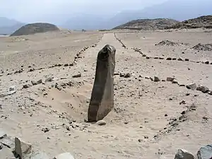 On a trouvé, par exemple, des géoglyphes et des lignes éparpillés dans les plaines désertiques, à côté de pierres sculptées dispersées, ainsi qu'une enceinte souterraine couverte à l'origine, qui semble être un observatoire. Il convient également de mentionner un monolithe (ou huanca) planté dans le sol d'une place publique, qui aurait été un instrument d'observation astronomique.