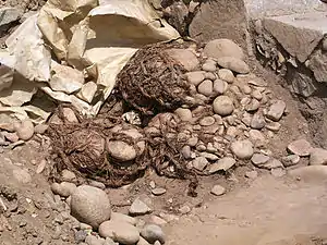 - Le quipu : Dans la pyramide « La Galerie », a été trouvé un reste textile qui a été interprété comme un quipu, l'ensemble des fils avec des nœuds que les Incas utilisaient comme un instrument mnémonique (c'est-à-dire comme un moyen de préserver des informations statistiques ou des messages à communiquer).