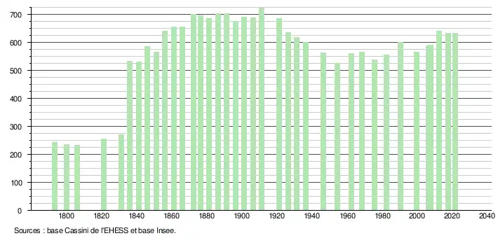 | L'évolution du nombre d'habitants est connue à travers les recensements de la population effectués dans la commune depuis 1793. Pour les communes de moins de 10 000 habitants, une enquête de recensement portant sur toute la population est réalisée tous les cinq ans, les populations légales des années intermédiaires étant quant à elles estimées par interpolation ou extrapolation[23]. Pour la commune, le premier recensement exhaustif entrant dans le cadre du nouveau dispositif a été réalisé en 2007[24]. En 2021, la commune comptait 634 habitants[Note 3], en diminution de 2,61 % par rapport à 2015 (Landes : +4,9 %, France hors Mayotte : +1,84 %). |