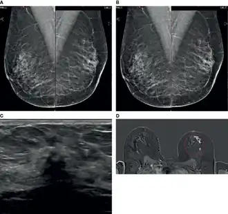 La mammographie est considérée comme la méthode d'imagerie de référence » pour la détection précoce du cancer du sein , avec une sensibilité allant généralement de 63 % à 98 %. Ceci est réalisé en produisant des images haute résolution, mettant en évidence les différences de contraste entre les tissus mammaires sains et malins [26]. La détection de cancer lobulaire par mammographie est notoirement difficile en raison du modèle de croissance tumorale infiltrant qui ne détruit pas les structures anatomiques sous-jacentes et ne provoque pas de réaction stromale. En raison de ces caractéristiques tumorales , la sensibilité de détection du cancer lobulaire par mammographie est beaucoup plus faible, comprise entre 57 % et 81 %. Les faux positifs ne sont pas non plus rares, avec des taux rapportés allant de 8 % à 24 % [27]. Le taux de faux négatifs dans le diagnostic de cancer lobulaire est beaucoup plus élevé que celui des autres cancers du sein invasifs [28]. Plus de la moitié des mammographies jugées ne montrant aucun signe de malignité se sont ensuite révélées évocatrices d’une tumeur.