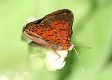 Le revers est rouge chez le mâle, orange chez la femelle.