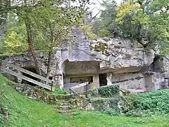 C'est un lieu de culte sans doute plus que séculaire à l'époque médiévale puisque le prieuré jouxte une petite falaise, creusée de galeries, d'habitats rupestres et de tombes anthropomorphiques[2], au pied de laquelle, sous un portique à colonnes, sourd encore de l'eau de l'ancienne source sacrée qui alimente un petit ruisseau à truites[3].