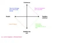 Le carré magique représente graphiquement les quatre grandes variables de la politique économique conjoncturelle d'un pays. Il s'agit de la croissance économique, de l'emploi, de l'équilibre extérieur, et de la stabilité des prix. Les gouvernements fixent normalement un objectif pour chaque : une croissance élevée, le plein emploi, une balance commerciale excédentaire, et la stabilité des prix. En reliant ces quatre variables (ou objectifs), on obtient un quadrilatère qui représente une situation économique favorable en tous points[1].
